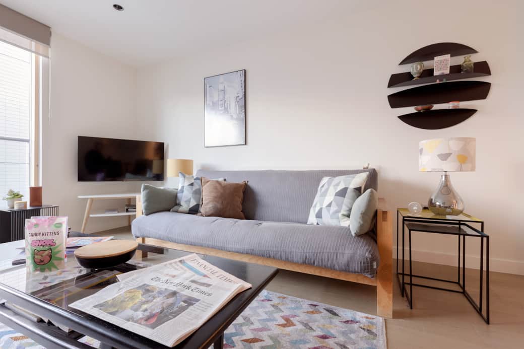 We love how much light pours into the living room from the glass doors that lead out onto a private balcony. Sip your morning coffee here as you survey the towering skyline before you or perch here with a sundowner before discovering the area’s food scene.